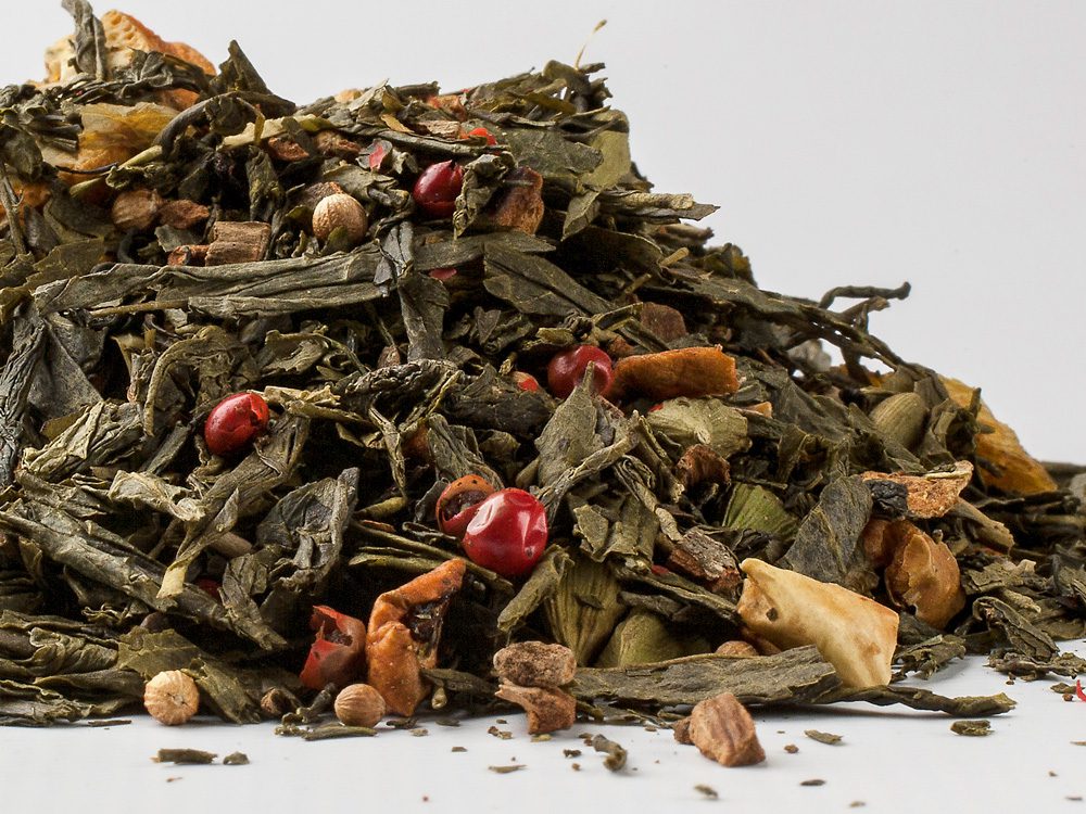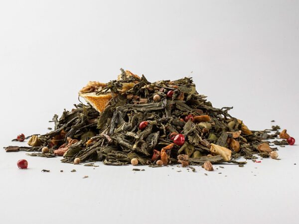 Popis Čínsky zelený čaj so škoricou, kúskami jablka a pomaranča, kardamónom, koriandrom, klinčekmi a ružovým korením. Nutričné údaje na 100 ml: Energia 3 kJ / 1 kcal. Tuky < 0,1 g z toho nasýtené < 0,1 g. Sacharidy 0,1 g z toho cukry < 0,1 g. Bielkoviny <0,1 g. Soľ <0,1 g.