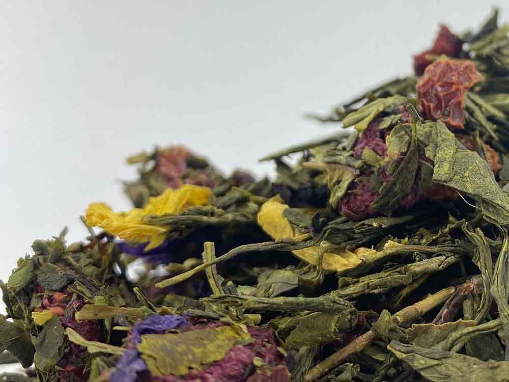 Popis Zelený čaj Sencha, ruža, mäta (5,1 %), aróma, červené maliny (3,3 %), slnečnica, slez. Nutričné údaje na 100 ml: