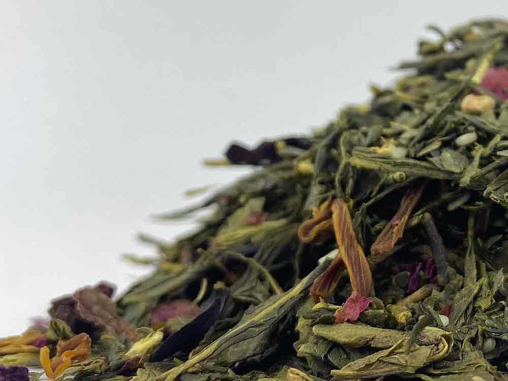 Popis Sencha, Bancha, Kukicha, sezam, stonky bambusu, bobule schizandry (divoké červené bobule), zázvor, ruža, aróma. Nutričné údaje na 100 ml: